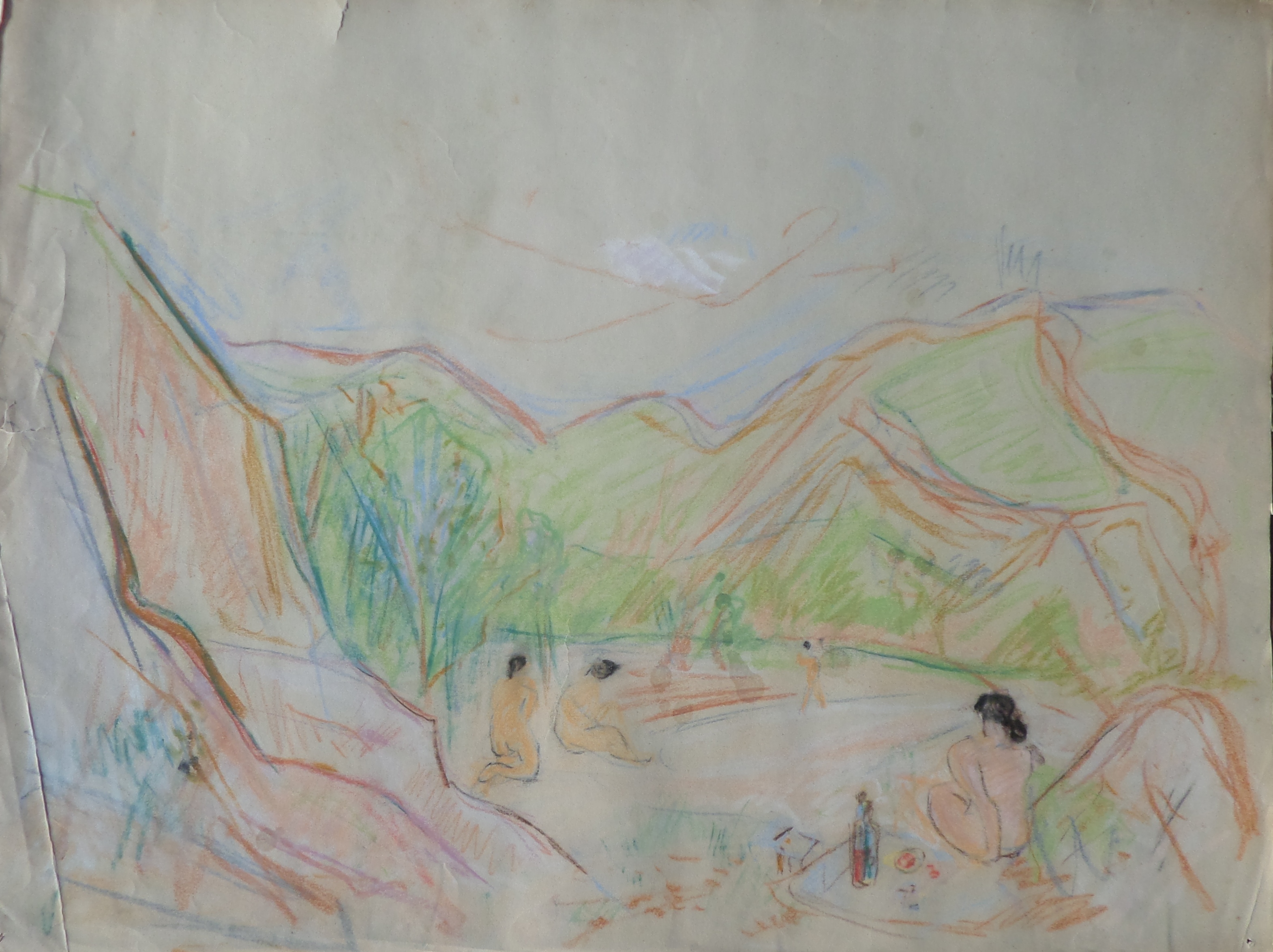 Drei nackte Frauen am Strand 1936 / Wachszeichnung, 66 x 50 cm Zeichnung von Peter Janssen 1906 -1979
