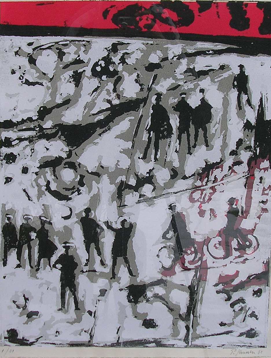 Figuren und Radfahrer Nr. 1/31 1961 / Lithografie, 55 x 69 cm Werk des Malers Peter Janssen 1906 - 1979 Privatbesitz: Stephan Kotthaus